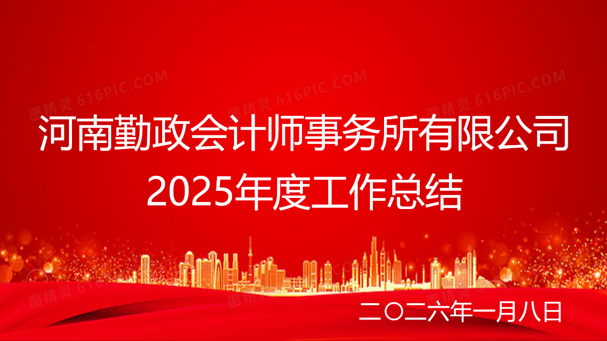 年度总结是经验的沉淀,更是前行的号角。2026年是"十五"规划开局之年,也是公司穿越周期、实现转型发展的关键一年。全体勤政人将以此次大会为新起点,以新质生产力为引领,以技术创新为支撑,以合作共赢为导向,以务实担当为底色,在行业变革中锚定航向,在攻坚克难中凝聚力量,奋力书写区域会计师事务所高质量发展的新篇章,为服务地方经济发展、助力行业转型升级贡献更大力量。